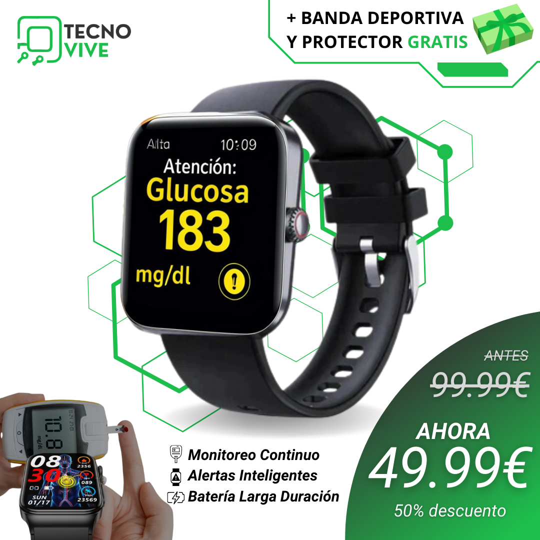 🔬 Monitoreo de Glucosa No Invasivo y en Tiempo Real: Mide los niveles de glucosa sin dolor, ofreciendo lecturas en tiempo real y alertas inmediatas.